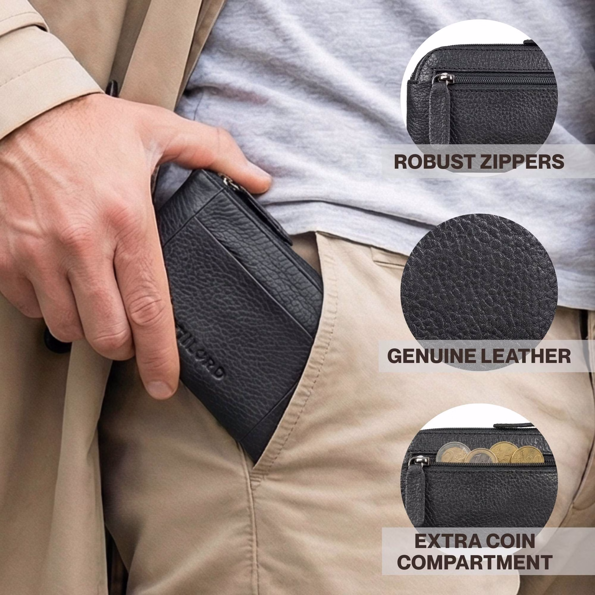 - PORĘCZNY FORMAT: Skórzane etui idealnie mieści się w kieszeni spodni i kurtki oraz trzyma klucze, bilon i najważniejsze karty razem. Bez długiego szukania, Z bezpieczną ochroną RFID – jeden ruch i wszystko jest od razu pod ręką.