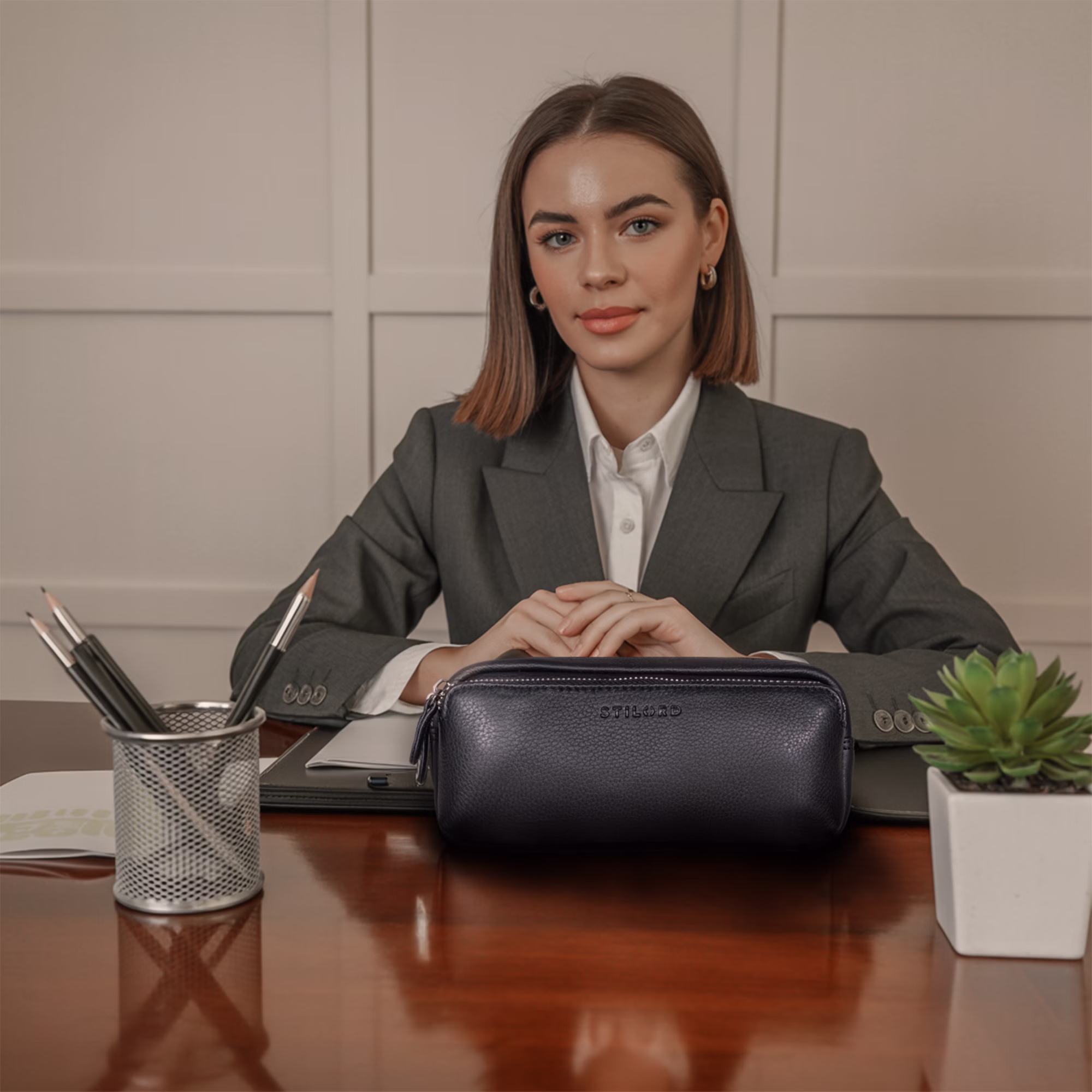 - Duże skórzane etui z dwoma zapinanymi na zamek przegródkami na zakreślacze, długopisy, linijkę 15 cm, gumkę i wiele innych artykułów piśmienniczych