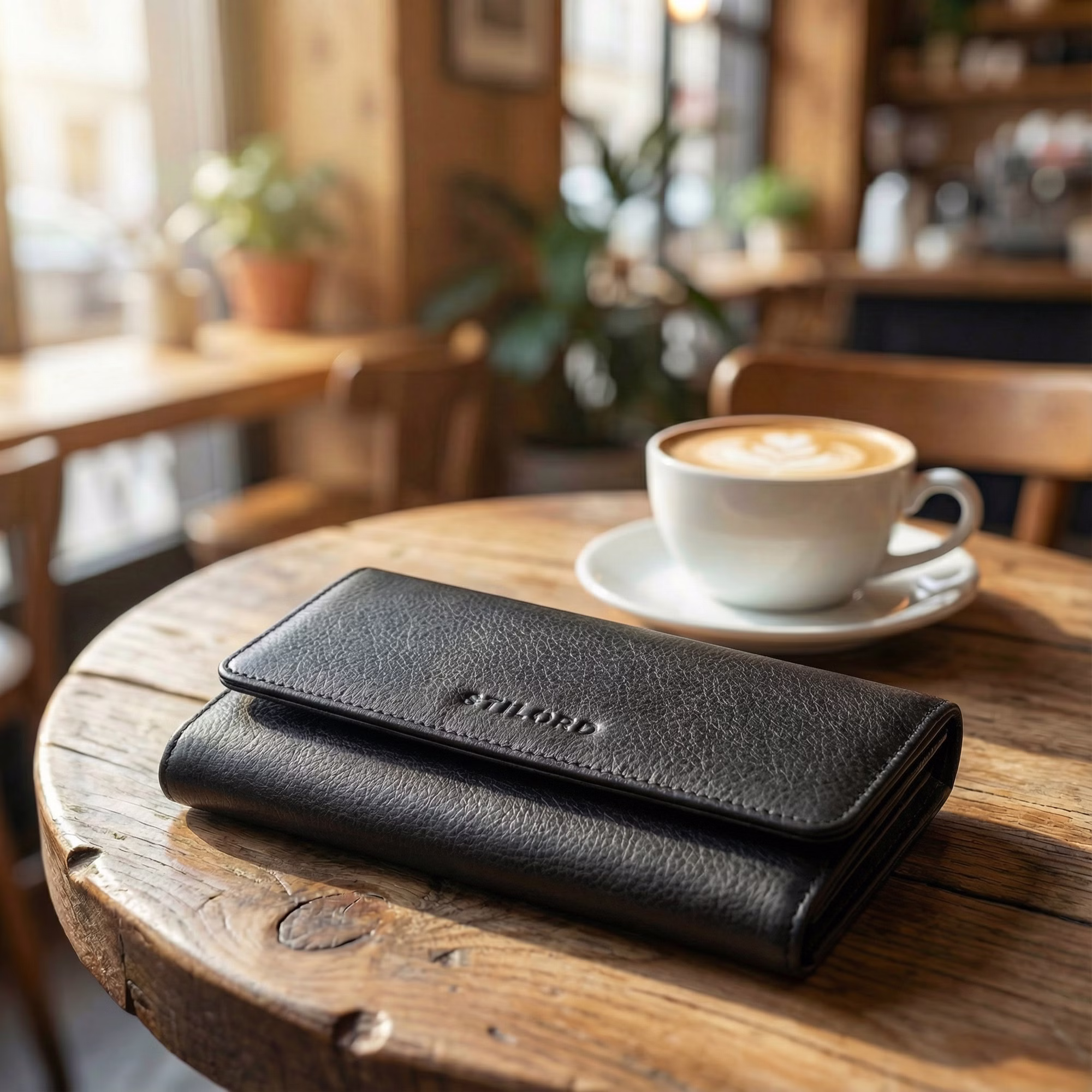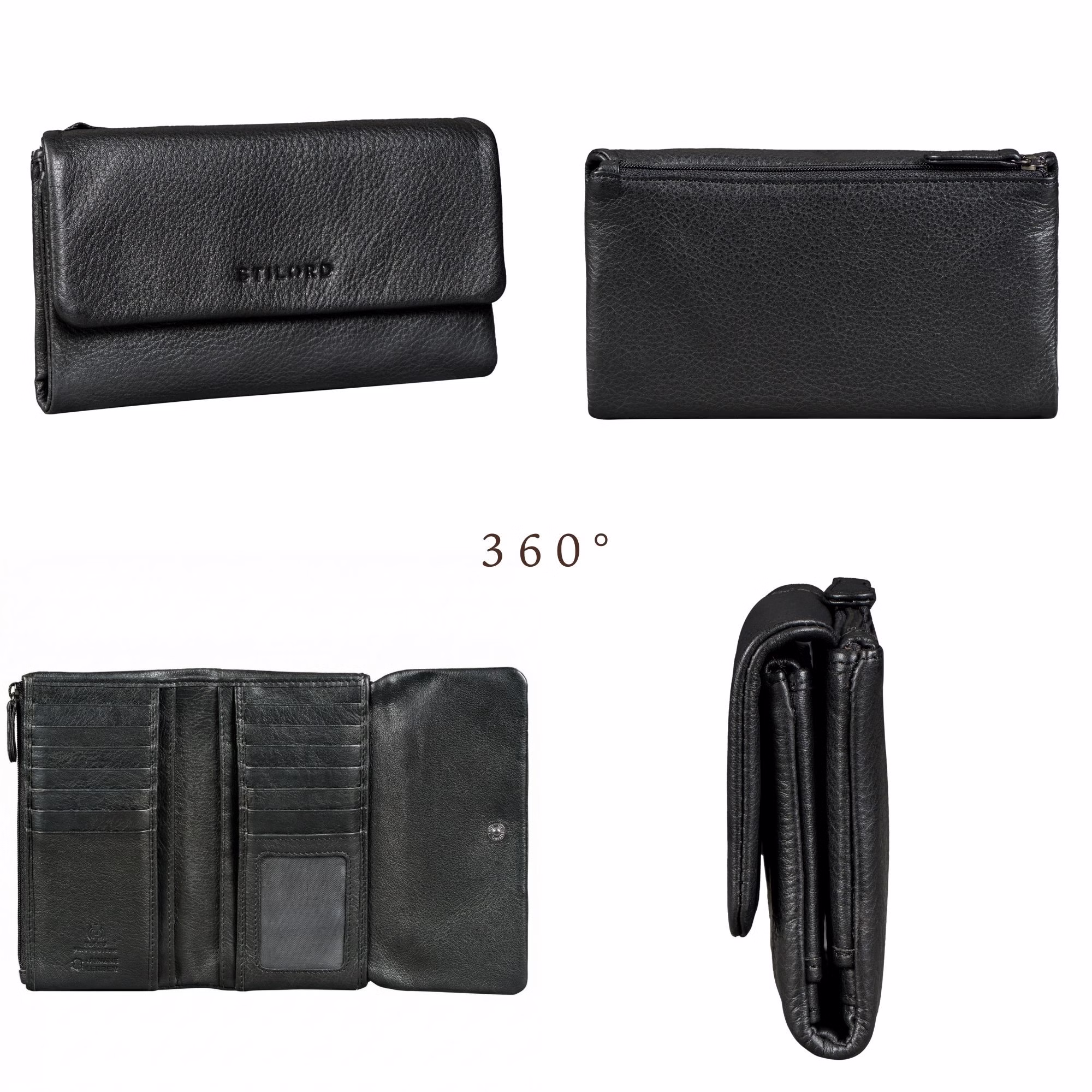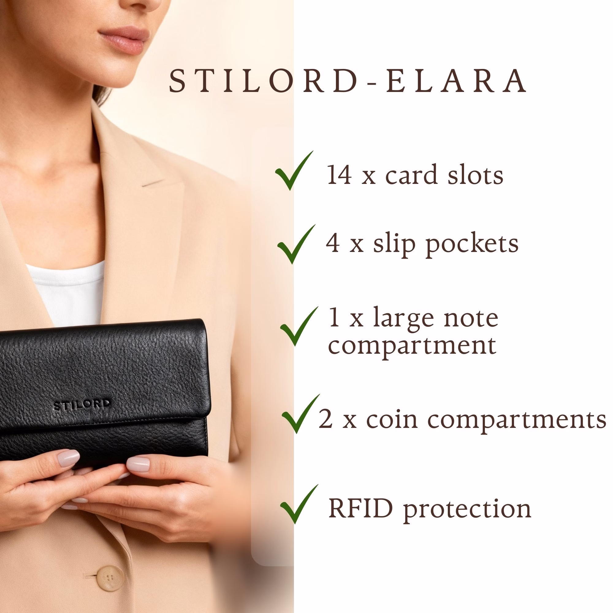 - SZCZEGÓŁY: Wymiary 18 x 3 x 11 cm | Waga: 160 g | Materiał: naturalna skóra wołowa | Model: "Elara" | Marka: STILORD | Kieszenie: 14 na karty, 4 wewnętrzne, 1 na banknoty, 1 duża kieszeń na monety na zamek | Zapięcie: zatrzask