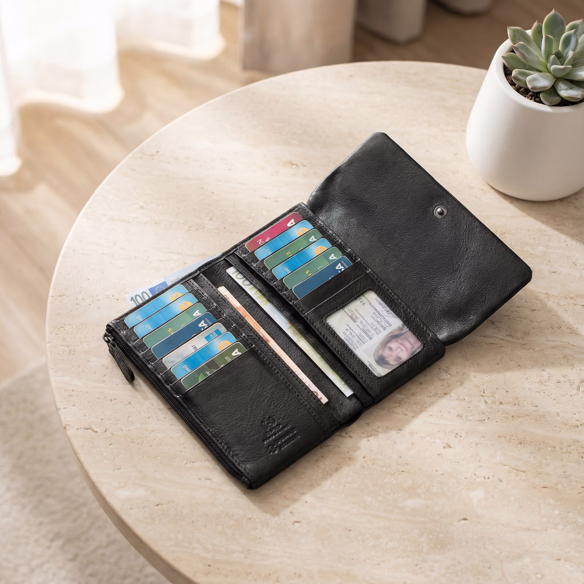 Dla kobiet, które cenią stylowy porządek: Elegancki, rozkładany portfel skórzany oferuje dużo miejsca na karty, gotówkę i paragony. Dzięki 14 przegródkom na karty, kieszeni z siateczką, czterem kieszeniom wewnętrznym i jednej przegrodzie na banknoty wszystko pozostaje przejrzyście ułożone i zawsze pod ręką. Rozkładany w sposób czytelny i bezpiecznie zamykany solidnym zatrzaskiem – idealny jako XL damski portfel z naturalnej skóry dla kobiet, które cenią organizację i ponadczasowy design.
