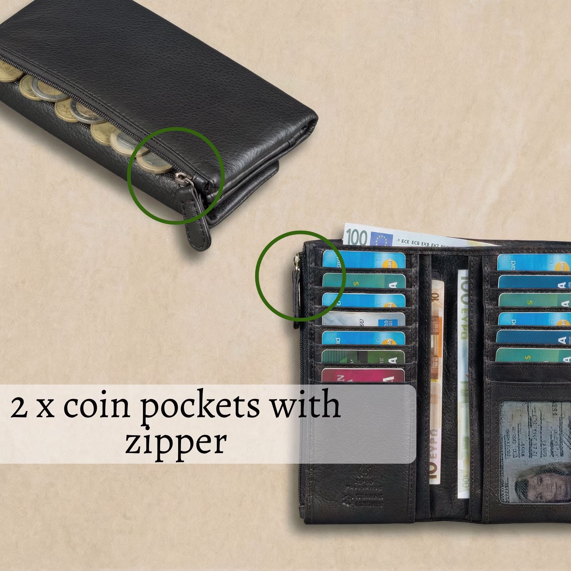 - XL PORTFEL NA KARTY DLA KOBIET: Skórzane etui z dużą kieszenią na monety oferuje 14 kieszeni na karty, kieszeń z siateczką, cztery kieszenie wewnętrzne, jedną przegrodę na banknoty oraz 2 dużą kieszeń na monety na zamek – przemyślane rozwiązanie na elegancki każdy dzień.