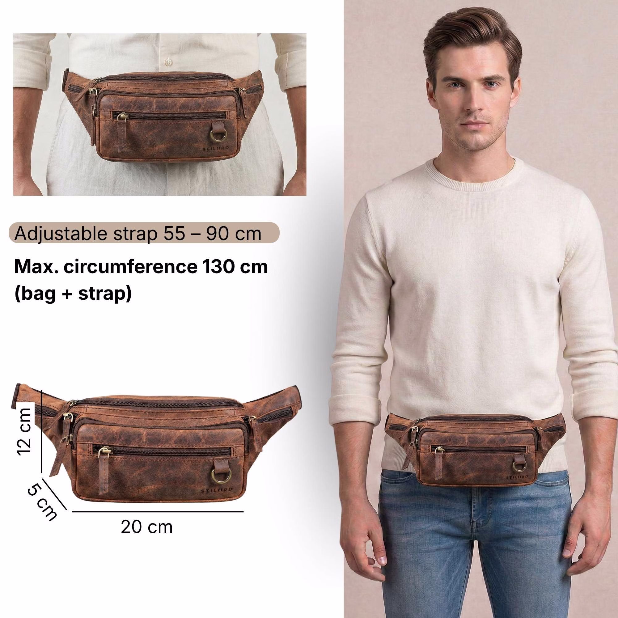 - WYMIARY: (dł. x szer. x wys.) ok. 20 x 5 x 12 cm | Model: "Robin" | Waga: 270 g | Marka: STILORD | Pasek: 55 - 90 cm | Całkowity obwód bioder z torbą i paskiem: maks. 130 cm | Design: Vintage / Retro | Kompatybilność: dla wszystkich smartfonów i tabletów do 7 cali
