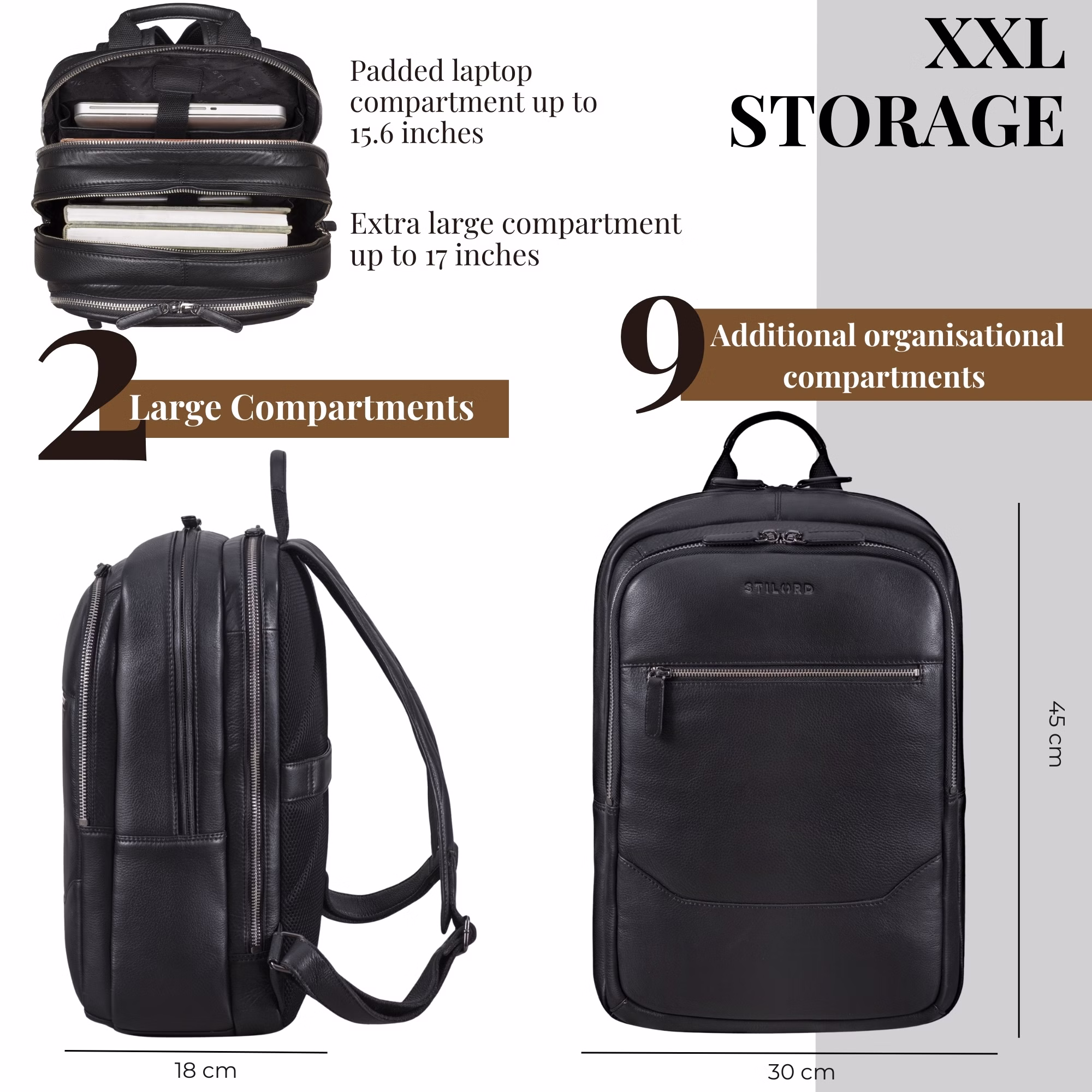 - WSZYSTKO W JEDNYM MIEJSCU: Wymiary: ok. 30 × 18 × 45 cm | Waga: 1100 g | Materiał: skóra bydlęca naturalna | Producent: STILORD | Kieszenie na laptop 16" (25 × 36 cm) | Główna komora (bez wyściółki) mieści laptopy do 17" (27 × 40 cm).