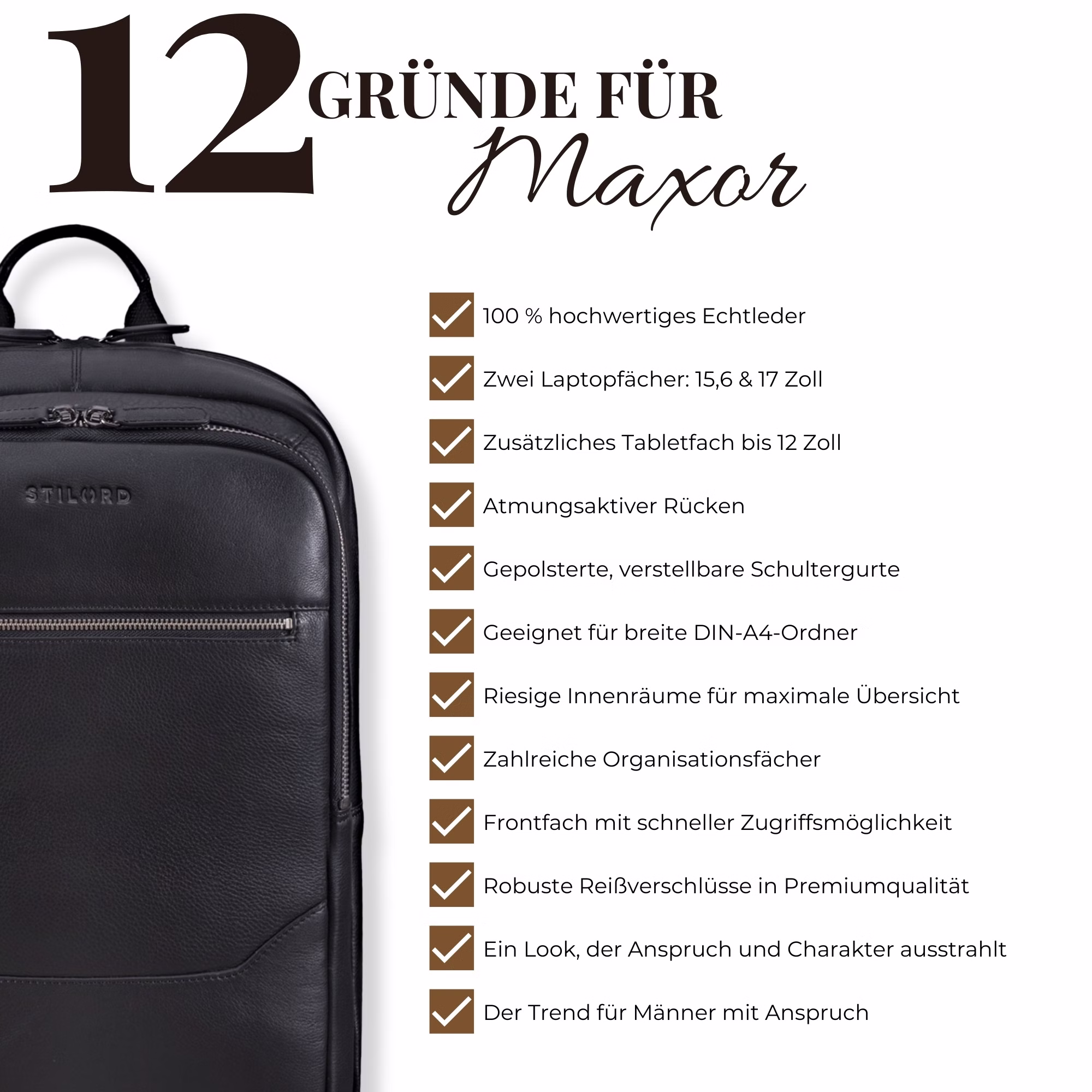 “Maxor” symbolizuje entuzjazm, rozwój i dynamikę. Aby zawsze być w ruchu, ten męski plecak ze skóry naturalnej został zaprojektowany zgodnie z najwyższymi standardami jakości. Wyściełane plecy, regulowane i wzmocnione szelki oraz praktyczny pasek do mocowania na walizce sprawiają, że ten plecak na laptopa 17 cali świetnie sprawdza się w codziennym życiu zawodowym.