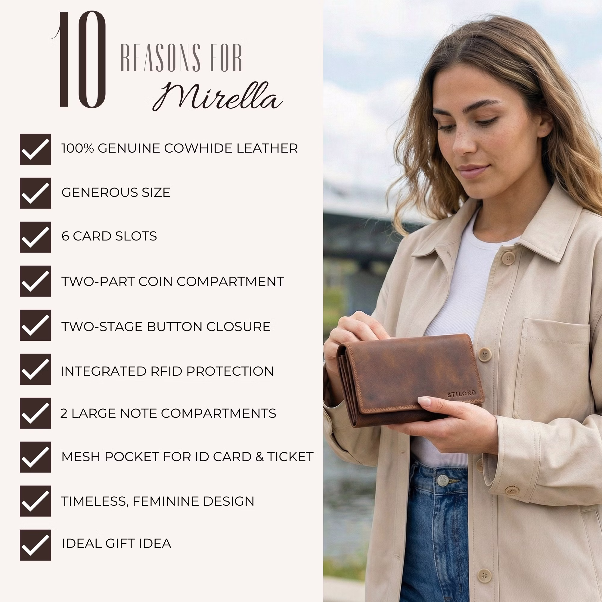 - SZCZEGÓŁY: Wymiary (dł. x szer. x wys.): 17 x 3 x 11 cm | Waga: 177 g | Materiał: Skóra naturalna | Model: "Mirella" | Marka: STILORD | Kompatybilność: Karty, monety, banknoty, notatki | Szczególne cechy: Ochrona RFID, wiele przegródek, elegancka pudełko na prezent.