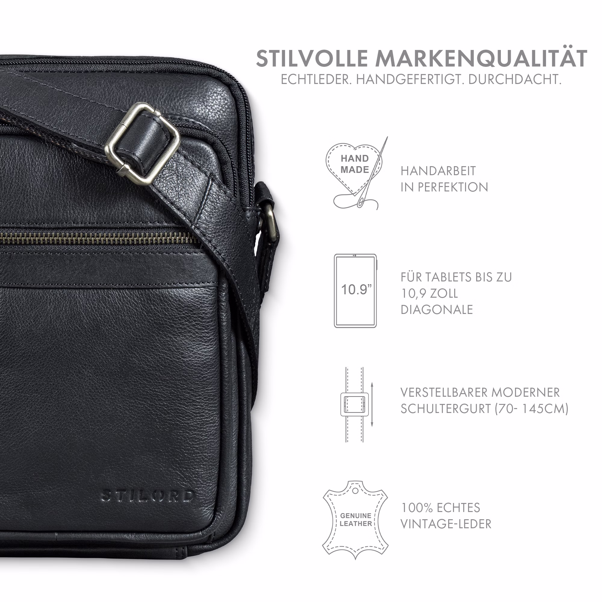 - Wymiary (D × S × W): 21 × 7 × 31 cm | Waga: 530 g | Materiał: prawdziwa skóra bydlęca | Producent: STILORD | Kompatybilność: iPad do 10,9 cala (18 × 25 cm), dokumenty A5 i butelka 0,5 l