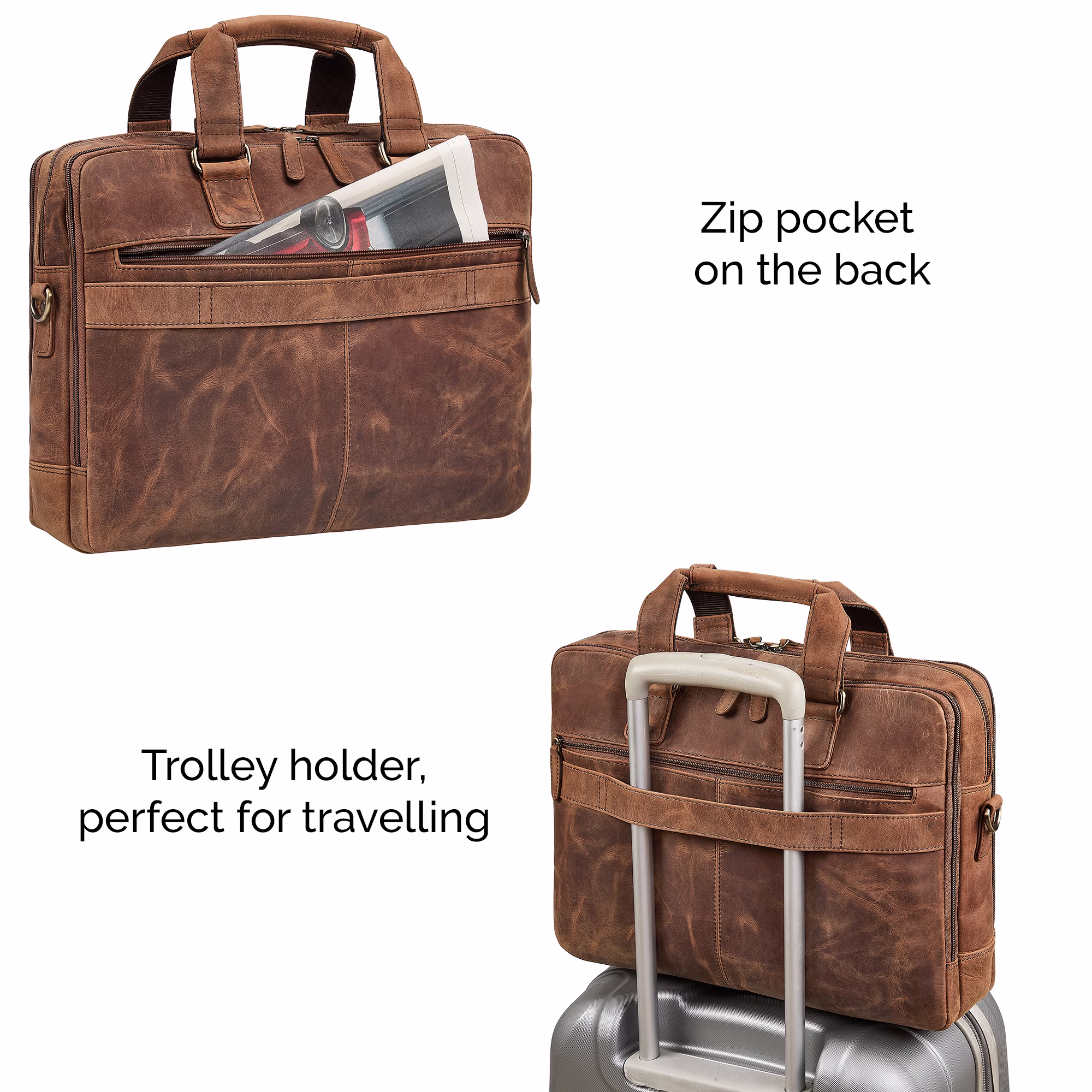 - Kompatybilna z wózkiem: dzięki zintegrowanemu uchwytowi na wózek męską skórzaną torbę na laptopa można łatwo przymocować do dowolnej walizki na kółkach.