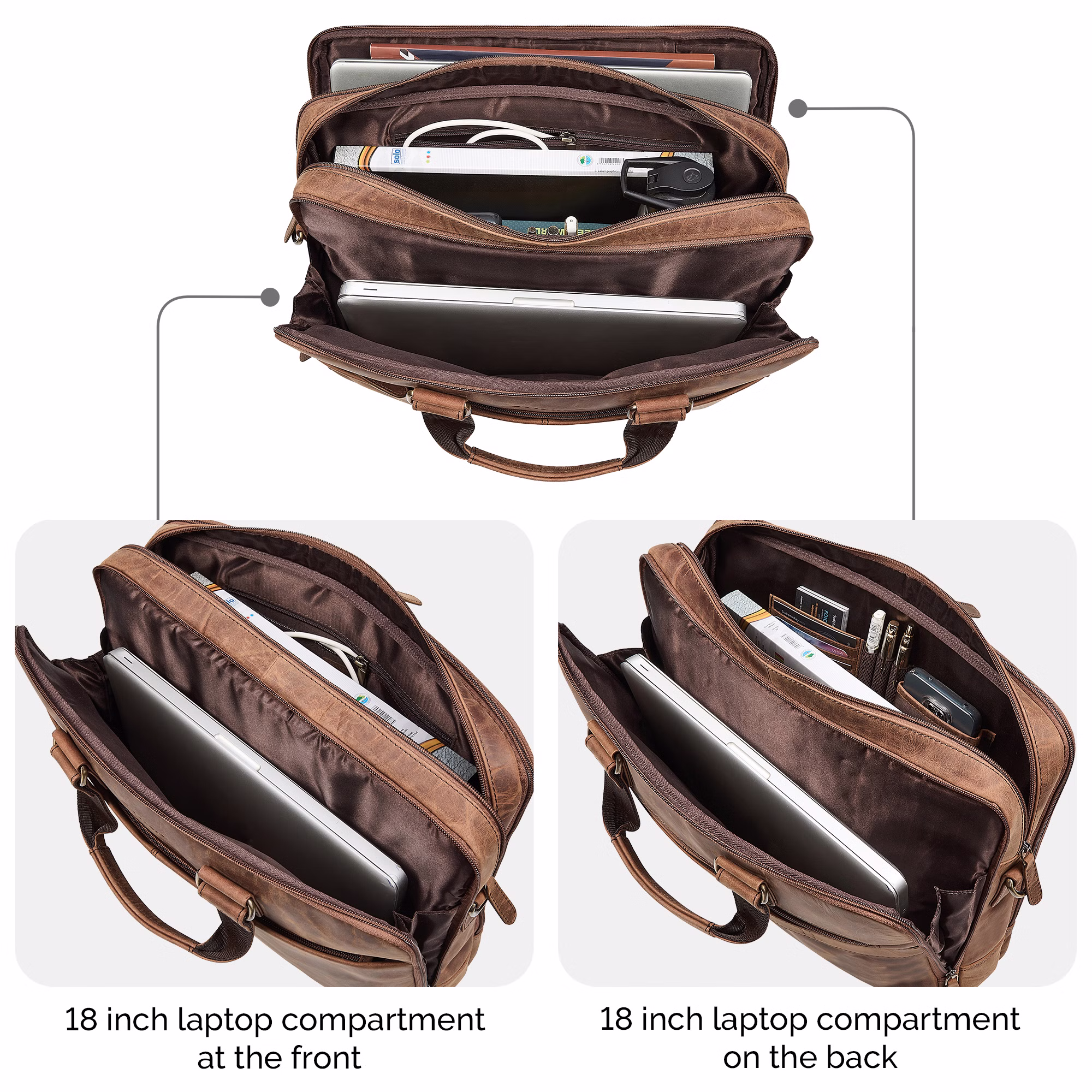 - DWIE WYŚCIEŁANE KOMORY NA LAPTOPA - DLA URZĄDZEŃ O WYMIARACH OD 15,6 DO 18 CALI: Optymalna ochrona dużych laptopów, MacBooków lub poufnych dokumentów o wymiarach do 40 × 30 cm. Torba biurowa z prawdziwej skóry dla mężczyzn, którzy chcą bezpiecznie i stylowo transportować technologię.