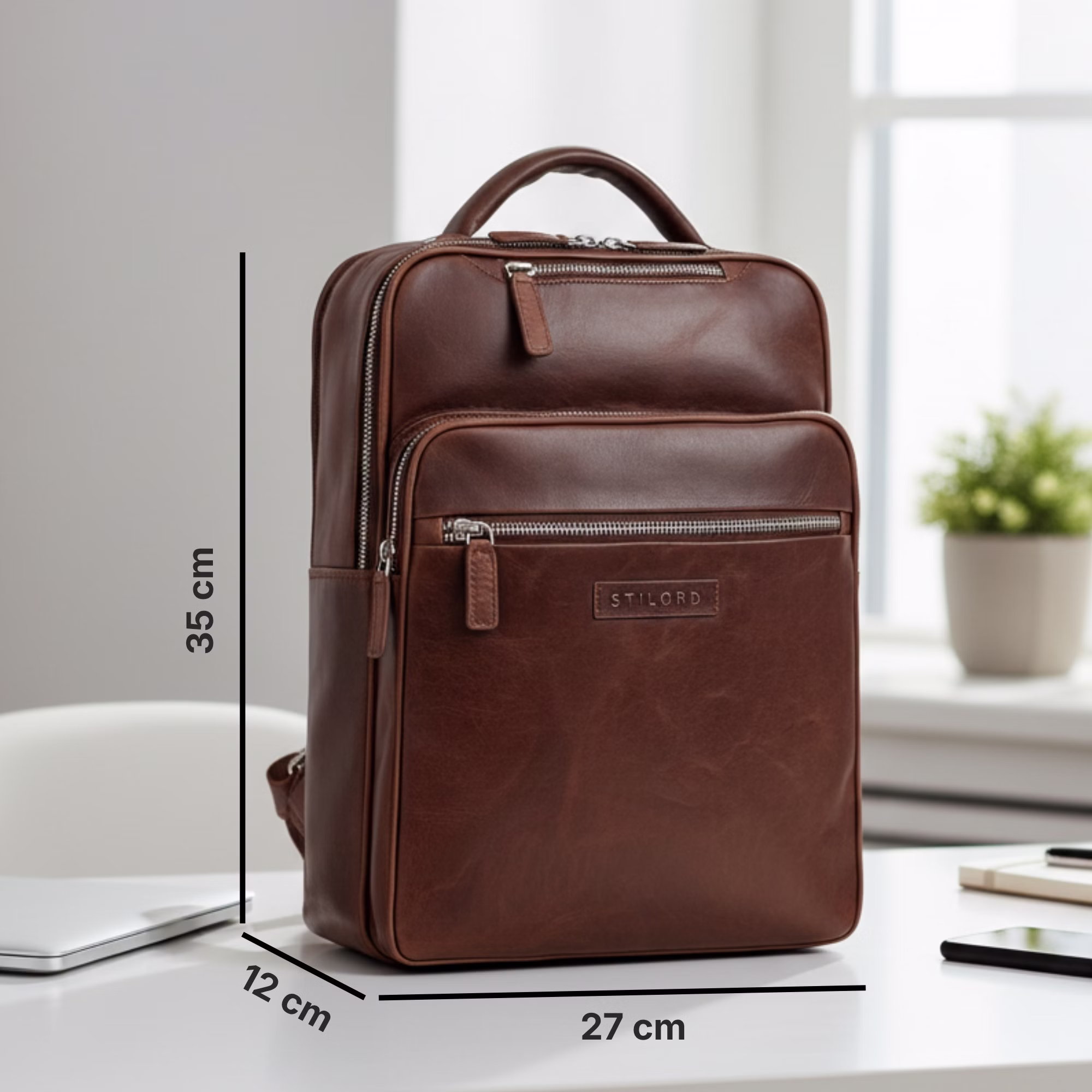- SZCZEGÓŁY: Wymiary: 27 x 12 x 35 cm | Waga: 1170 g | Materiał: naturalna skóra bydlęca | Model: "Kaya" | Marka: STILORD | Kompatybilność: laptop do 14 cali, dokumenty DIN A4, butelka 1,5 l | Cechy szczególne: elegancki design, wyściełana przegroda na laptopa, wodoodporna skóra