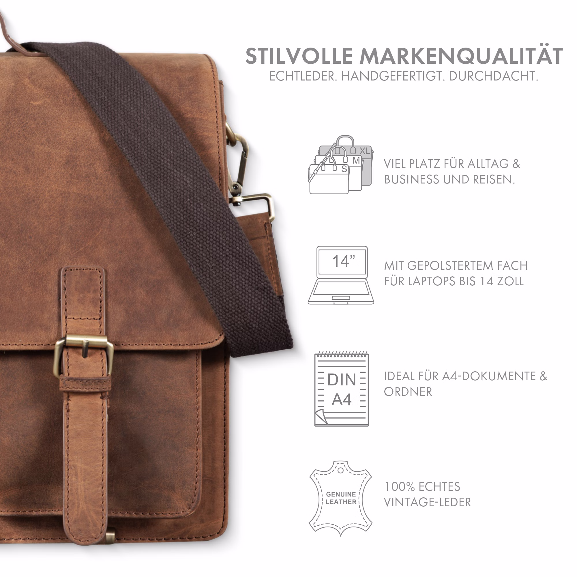 - Duża torba robocza oferuje miejsce do przechowywania dużej teczki z plikami DIN A4, książek i 14-calowych laptopów | wszechstronna | możliwość noszenia dzięki regulowanemu i odpinanemu paskowi na ramię (75 - 140 cm | 4 cm szerokości): może być noszona jako zabytkowa teczka, skórzana torba służbowa lub duża torba na ramię