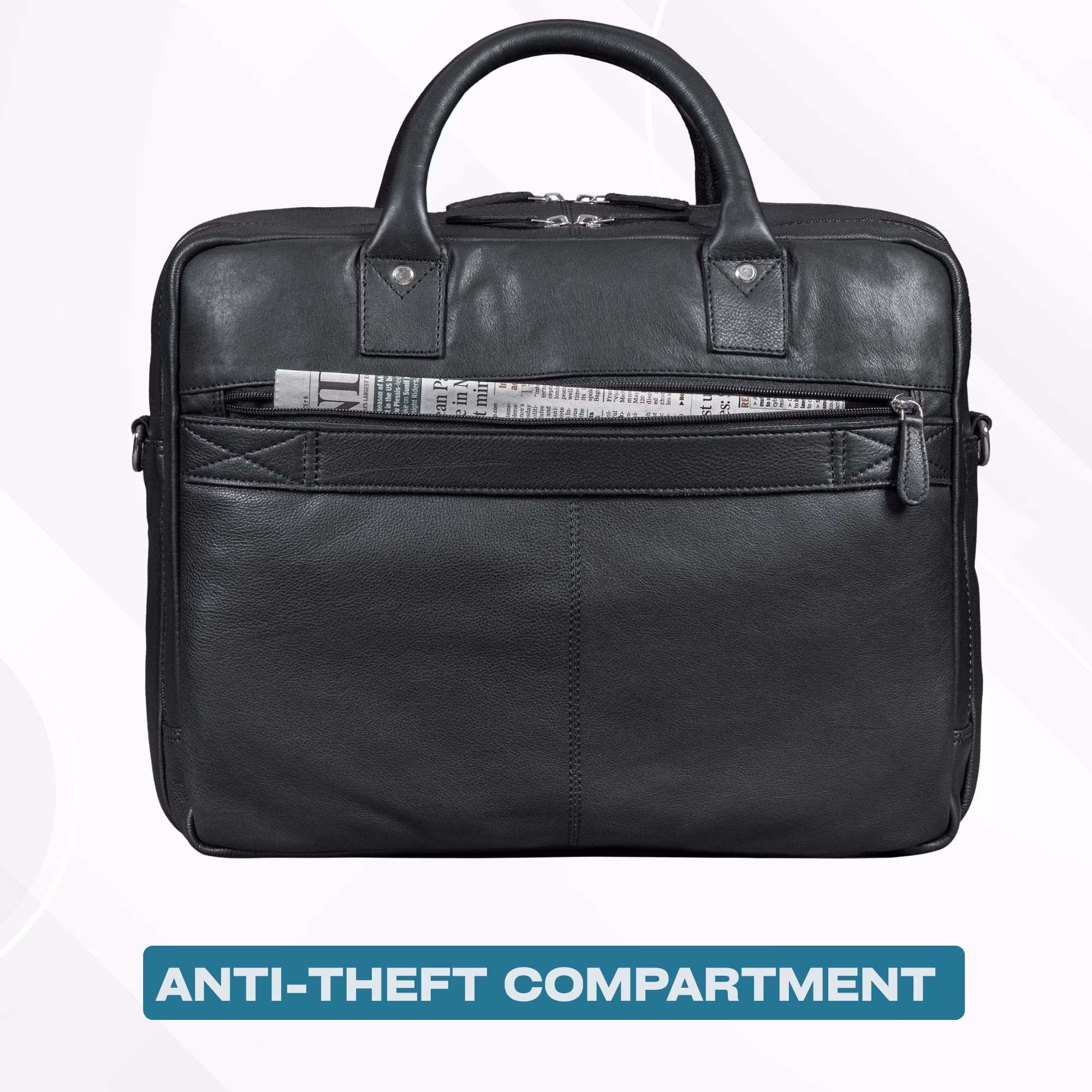 - ORGANIZACJA DLA TECHNIKI I DOKUMENTÓW: Duża komora główna na szerokie segregatory A4 i wyściełana przegroda na laptopa (15,6 cala), podwójna komora, liczne kieszenie na zamek i otwarte, a także kieszeń antykradzieżowa – teczka skórzana męska "Jerome" gwarantuje perfekcyjną organizację w codziennej pracy.