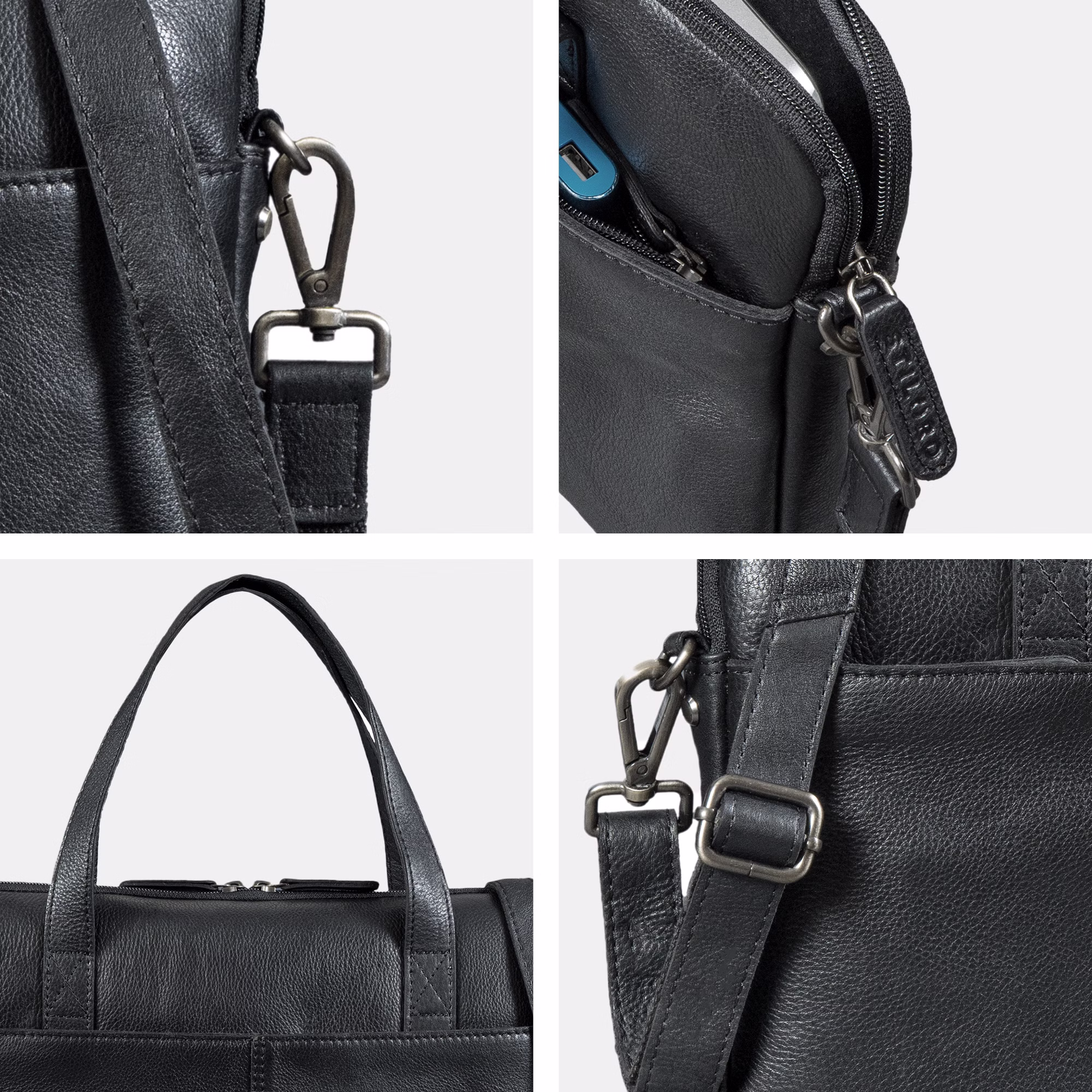 - Eleganckie wykonanie: dokładne szwy, podwójny suwak i metalowe elementy podkreślają solidność tej skórzanej torby biznesowej.