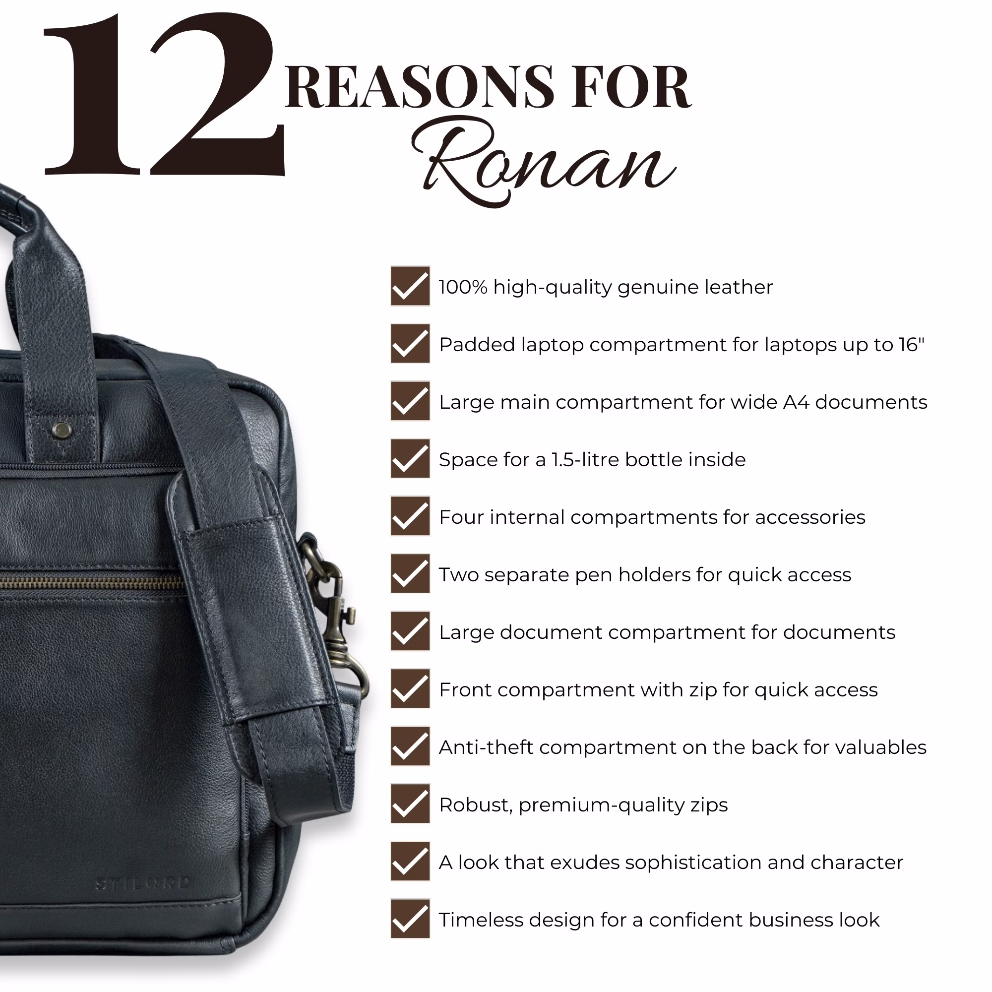 - PONADCZASOWA. SUWERENNA. RONAN: skórzana torba na laptopa męska "Ronan" łączy przejrzysty format (40 x 10 x 30 cm), naturalną skórę licową oraz ponadczasowy design vintage. Niezależnie od tego, czy to biuro, spotkanie biznesowe czy uczelnia – ta skórzana torba na ramię dla mężczyzn towarzyszy Ci profesjonalnie, stylowo i niezawodnie w każdym wyzwaniu.