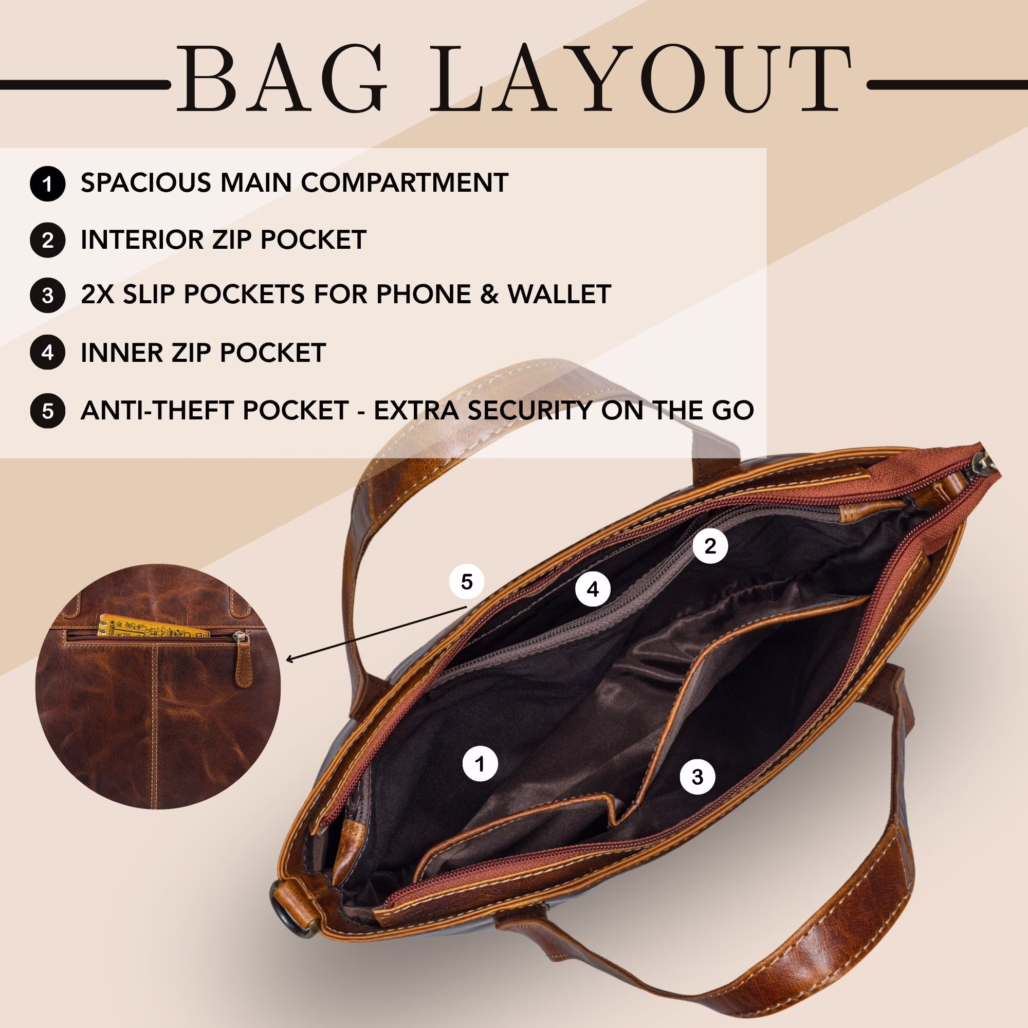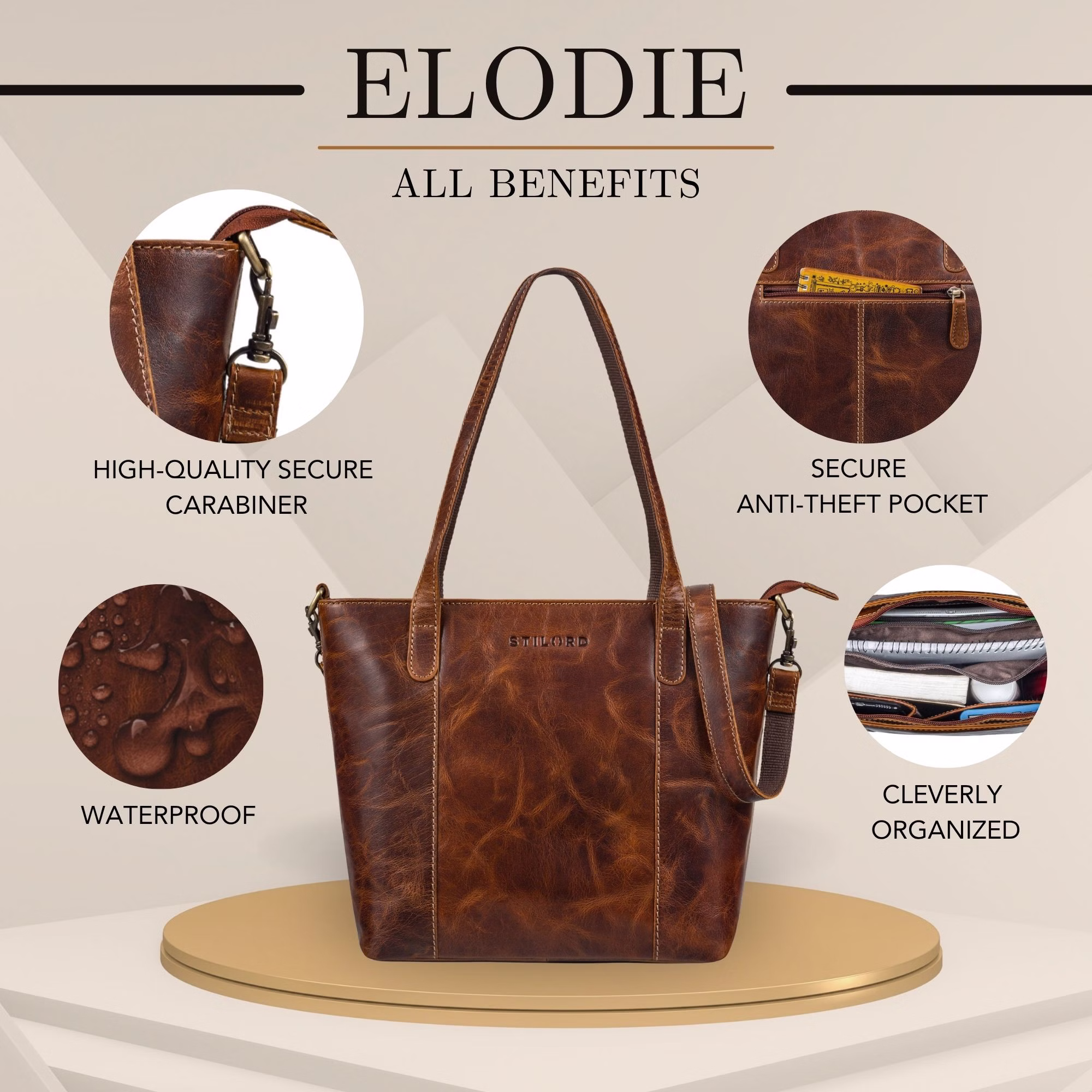 - INTELIGENTNA ORGANIZACJA: Bałagan w torebce? Nie z „Elodie”. Ta damska torebka ze skóry naturalnej to shopper z wieloma przegródkami: komora główna, kieszenie wewnętrzne i zewnętrzne mieszczą laptop do 13 cali, butelkę 1L, dokumenty A4, smartfon, klucze i kosmetyki – wszystko uporządkowane.