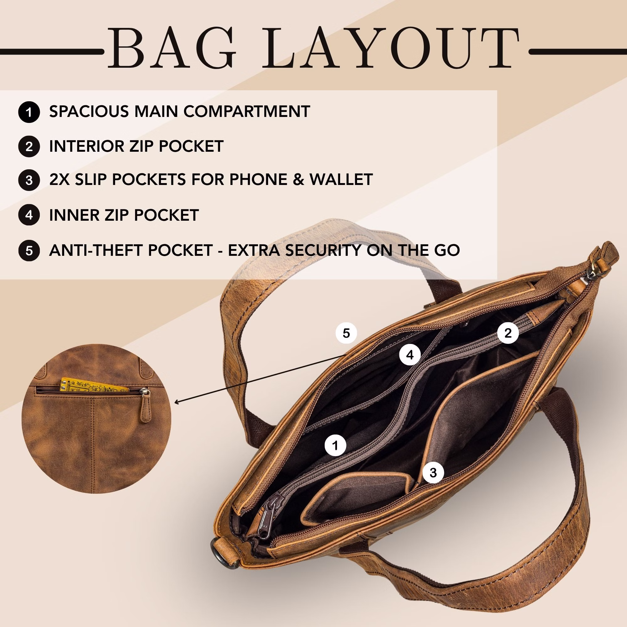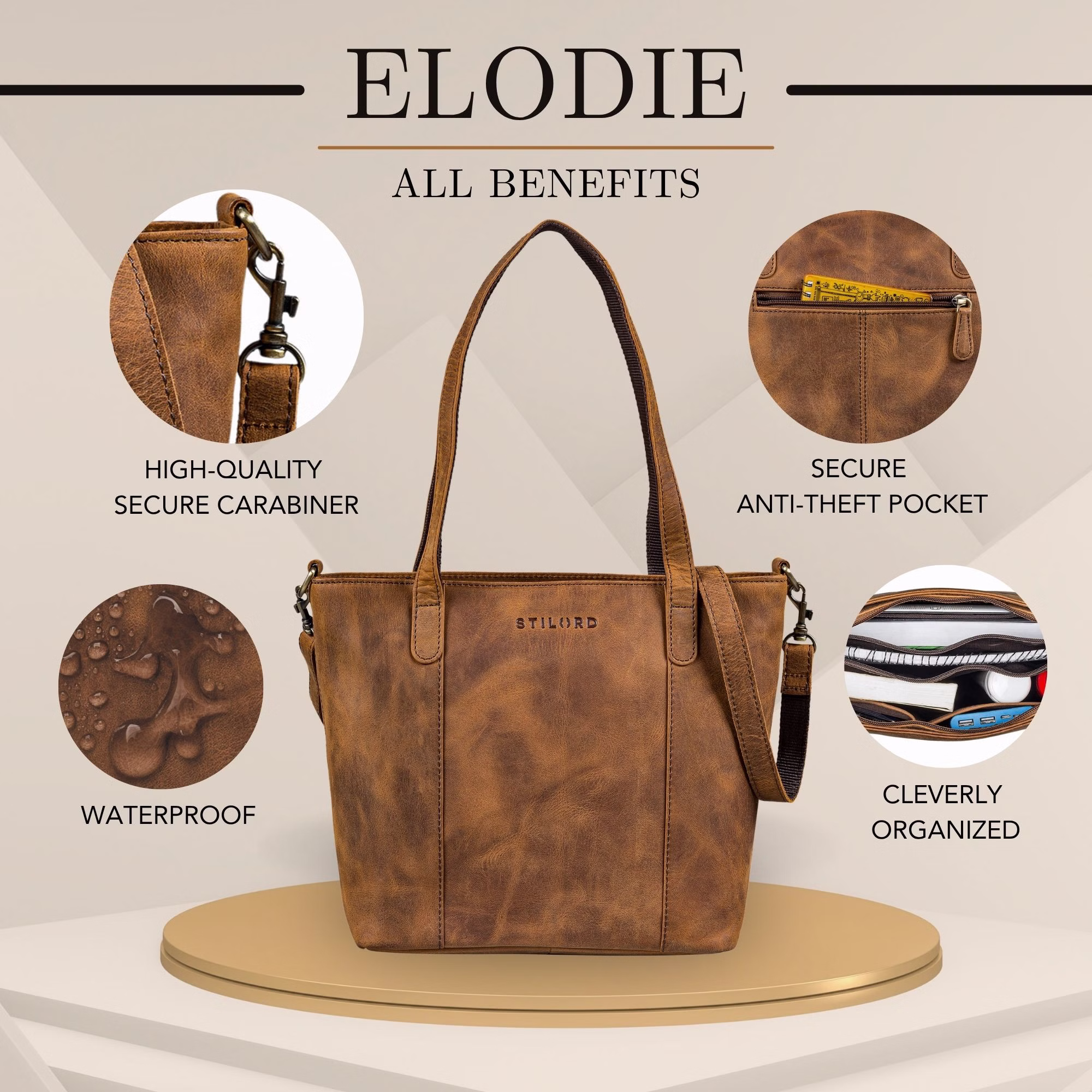 - INTELIGENTNA ORGANIZACJA: Bałagan w torebce? Nie z „Elodie”. Ta damska torebka ze skóry naturalnej to shopper z wieloma przegródkami: komora główna, kieszenie wewnętrzne i zewnętrzne mieszczą laptop do 13 cali, butelkę 1L, dokumenty A4, smartfon, klucze i kosmetyki – wszystko uporządkowane.