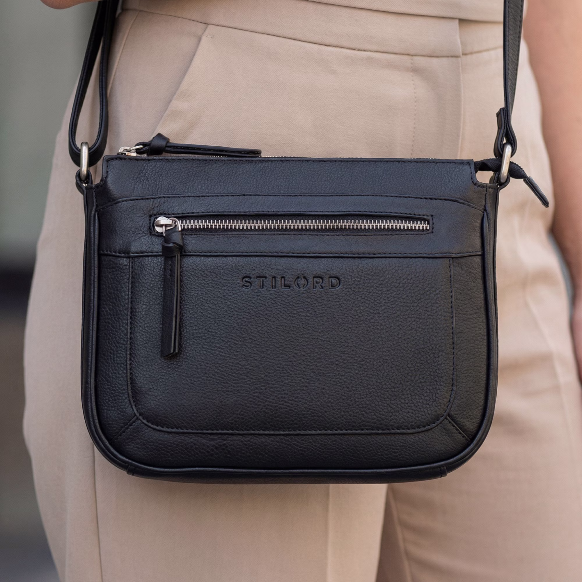 Szukasz swojej nowej ulubionej torebki? Odkryj "Philine" – skórzaną torebkę damską vintage marki STILORD. Ta elegancka torebka crossbody damska oferuje miejsce na makijaż, smartfon, małą butelkę wody, portfel i klucze. Nosi się ją wygodnie – zarówno przez ramię, jak i klasycznie na ramieniu.