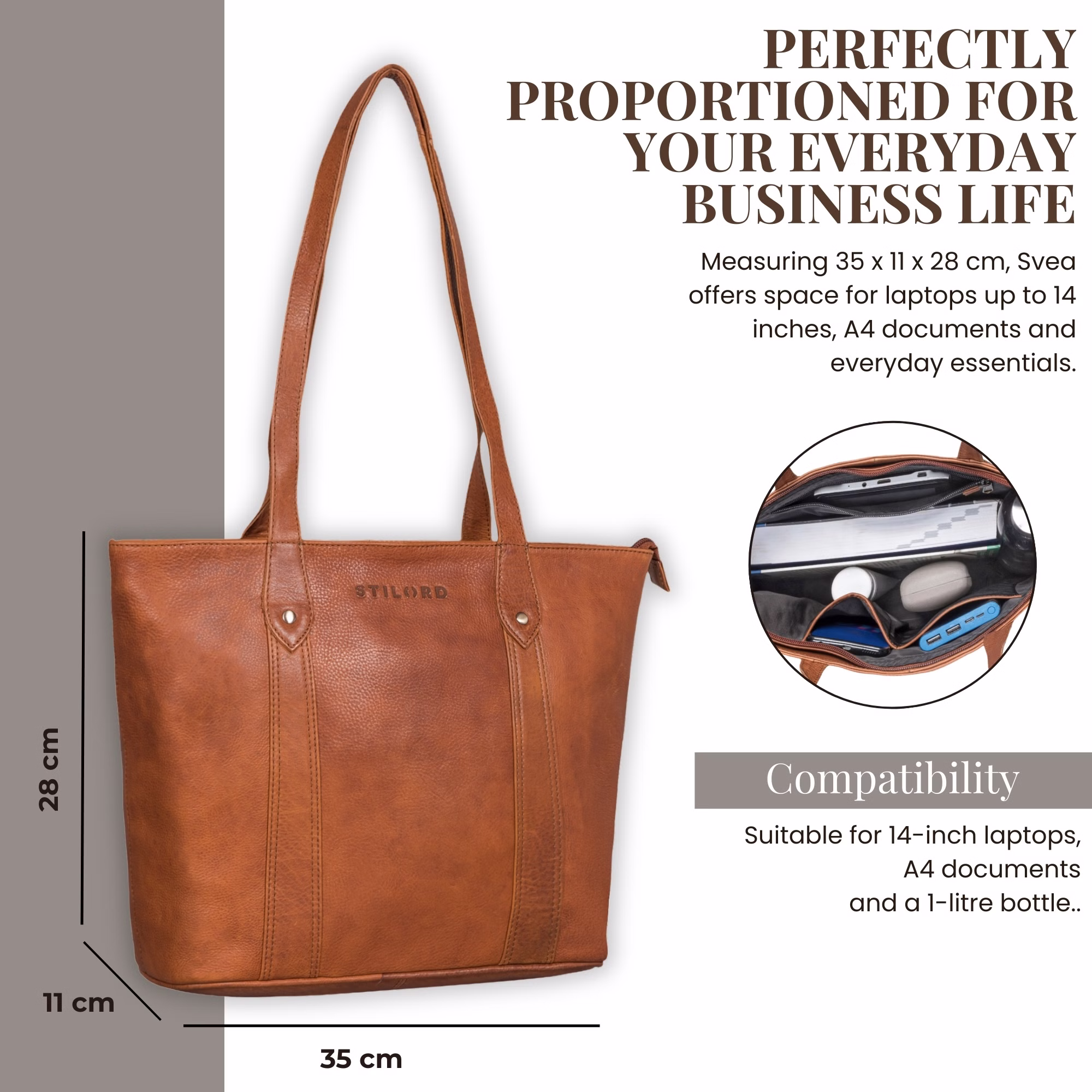 - SZCZEGÓŁY: Wymiary 35 x 11 x 28 cm. | Waga 635 g. | Materiał: prawdziwa skóra bydlęca | Model: "Svea" | Marka: STILORD | Kompatybilność: laptop 14 cali, dokumenty DIN A4, butelka 1 L | Atuty: przemyślany układ wnętrza, ponadczasowy wygląd vintage.