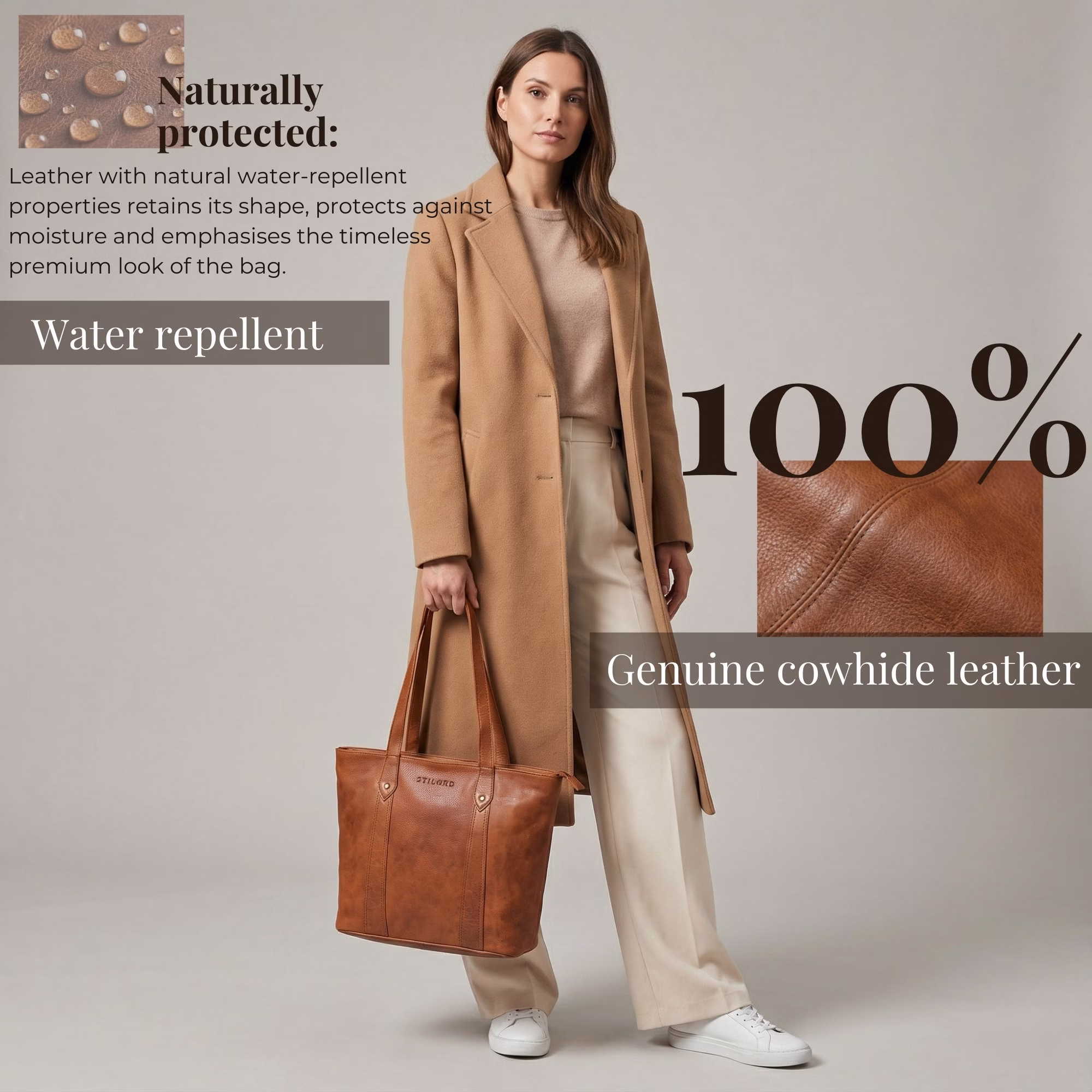 Bezpieczeństwo: Damska skórzana torba shopper wodoodporna: nasze skóry są hydrofobowe i zapewniają trwałą ochronę nawet podczas deszczu.